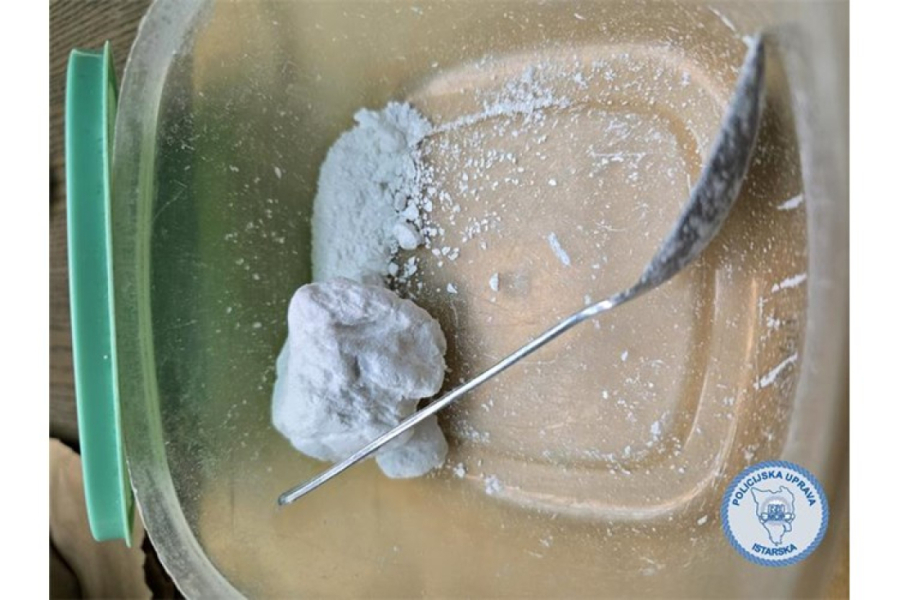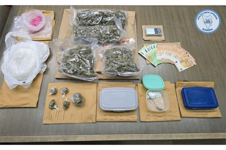 Policijski službenici su temeljem naloga nadležnog suda obavili pretragu vozila i prostorija na području Pule koje koriste osumnjičeni kojom prilikom je pronađeno i oduzeto ukupno 1.246,2 grama amfetamina, 1.165,5 grama marihuane, 384 tablete ecstasya, 66 kutija lijekova za potenciju, precizna digitalna vaga, elektronički uređaji i nekoliko tisuća eura za koje se sumnja da potječu od prodaje droge.
