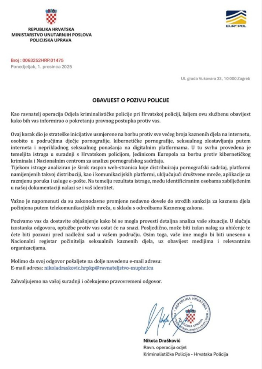 Potpisnik lažnog dopisa je navodni ravnatelj Odjela kriminalističke policije koji od primatelja traži da odgovori na poruku ili će u protivnom biti uhićen i predan pravosudnim tijelima.