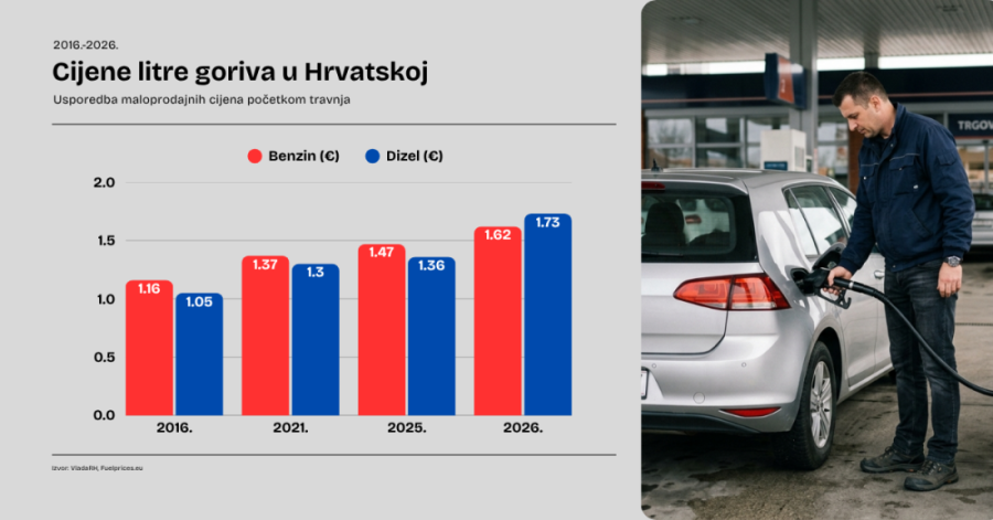 Početkom travnja 2026. litra dizela stoji 1,73 eura, a litra benzina 1,62 eura; takve cijene još nisu na razini rekordnih iz 2022. koje su bile potaknute ratom u Ukrajini, no građani bi svejedno mogli osjetiti razliku u svojem budžetu.