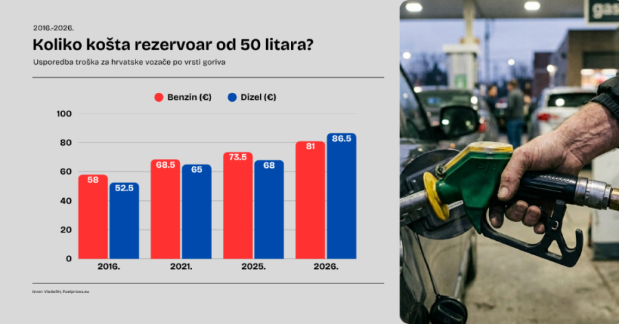 Za vozače koji toče benzin, punjenje istog rezervoara danas iznosi oko 81 euro, naspram 73,50 eura lani i 58 prije 10 godina. U tom razdoblju povećao se standard hrvatskih građana, ali on je praćen i konstantnim rastom cijena.