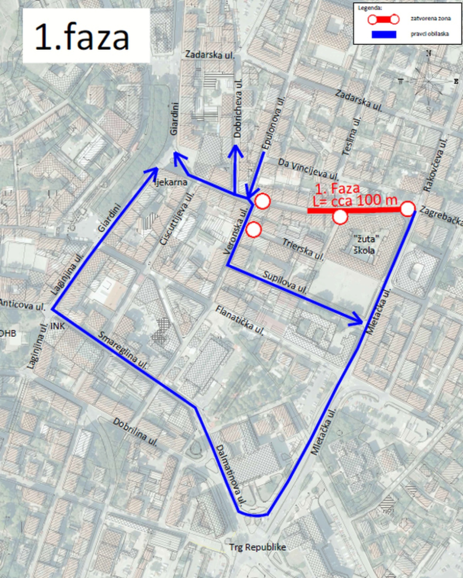 U prvoj fazi koja će trajati od 05. do 12. studenoga predviđeno je zatvaranje dionice, osim za vozila gradilišta, od križanja sa Rakovčevom ulicom do križanja sa Veronskom ulicom.