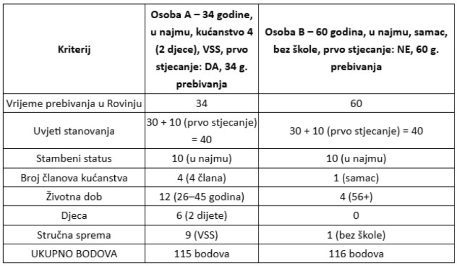 Privremena lista jasno otkriva da mlade obitelji gotovo nemaju nikakvu šansu. Sustav bodovanja u najvećoj mjeri nagrađuje godine prebivanja u Rovinju, što automatski stavlja u prednost starije samce pred mladim obiteljima s djecom i obrazovanjem.