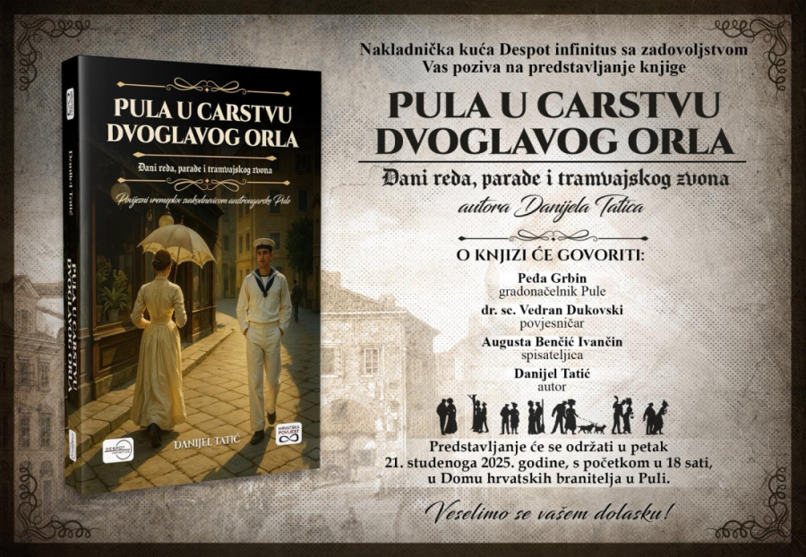 Pula, grad na raskrižju epoha i carstava, glavna je protagonistica nove knjige povjesničara Danijela Tatića „Pula u carstvu dvoglavog orla – dani reda, parade i tramvajskog zvona“, koja će biti predstavljena u petak, 21. studenoga, u 18 sati u Domu hrvatskih branitelja.