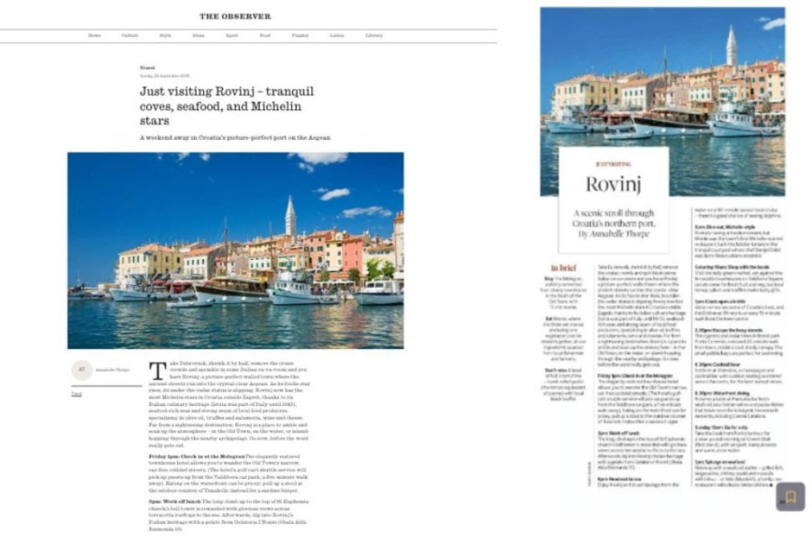 Prestižni Britanski The Observer u putopisnoj kolumni predstavio je Rovinj kao slikoviti grad na Jadranu koji spaja talijanski šarm, skrivene uvale i razvijenu gastronomsku scenu.
