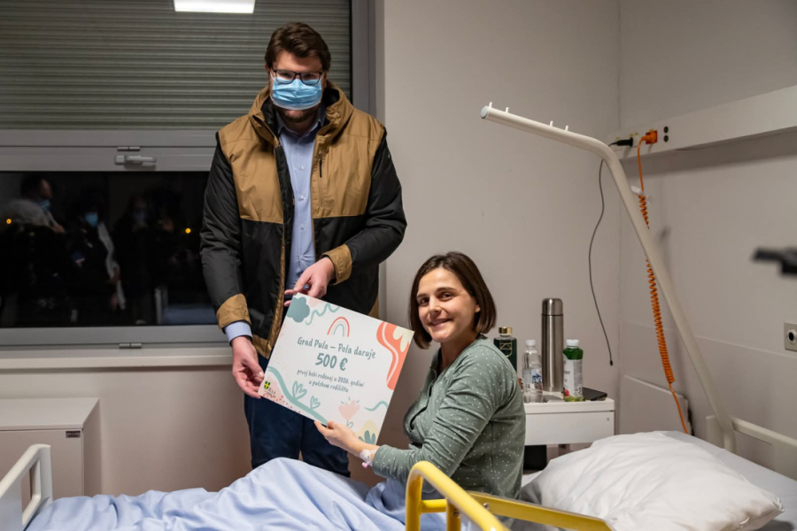 Tim povodom rodilište Opće bolnice Pula danas je posjetio pulski gradonačelnik Peđa Grbin, koji je sretnoj majci osobno čestitao te joj uručio ček u iznosu od 500 eura i prigodan poklon-paket s osnovnim potrepštinama za novorođenče.