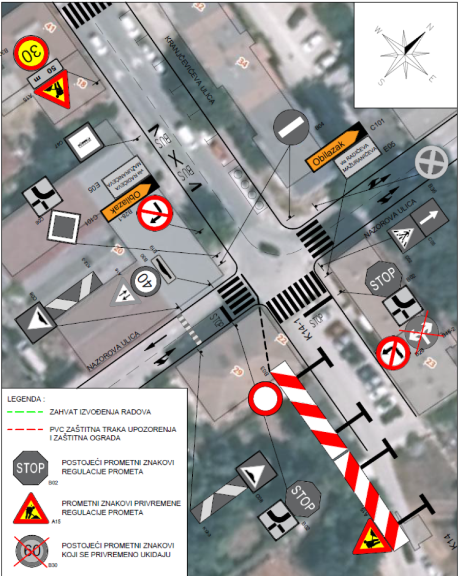 Grad Pula odobrio je izvođaču radova STRUCTURA d.o.o. uvođenje privremene regulacije prometa na dijelu Nazorove ulice, od raskrižja s Kranjčevićevom do raskrižja s Mažuranićevom ulicom, radi nastavka izvođenja građevinskih radova betoniranja u sklopu izgradnje zgrade na k.č. br. 6097/9, k.o. Pula, temeljem važeće građevinske dozvole.