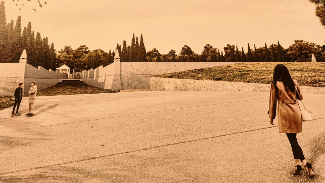 Koncepcija, kako je pojasnio, preoblikuje šumu koja okružuje postojeće monumentalno ograđeno groblje arhitekta Enrica Nordija u šumsko groblje, omeđeno jasno definiranim rubom: granicom između svetog i svjetovnog.