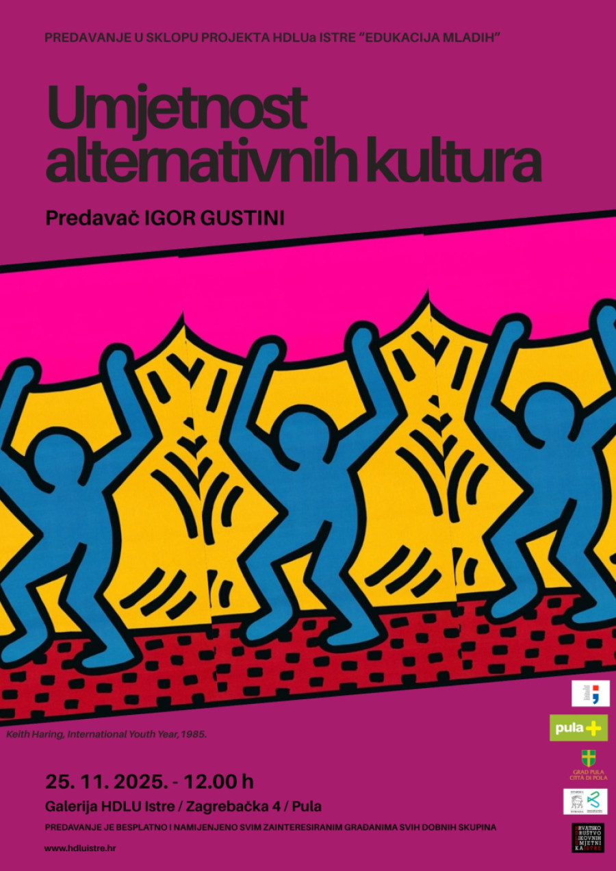 Iz HDLU-a Istre sa zadovoljstvom najavljuju predavanje "Umjetnost alternativnih kultura" u sklopu njihovog projekta "Edukacija mladih" koje će se održati u utorak, 25. studenog, u 12 sati u galeriji HDLU-a Istre na adresi Zagrebačka 4, Pula.