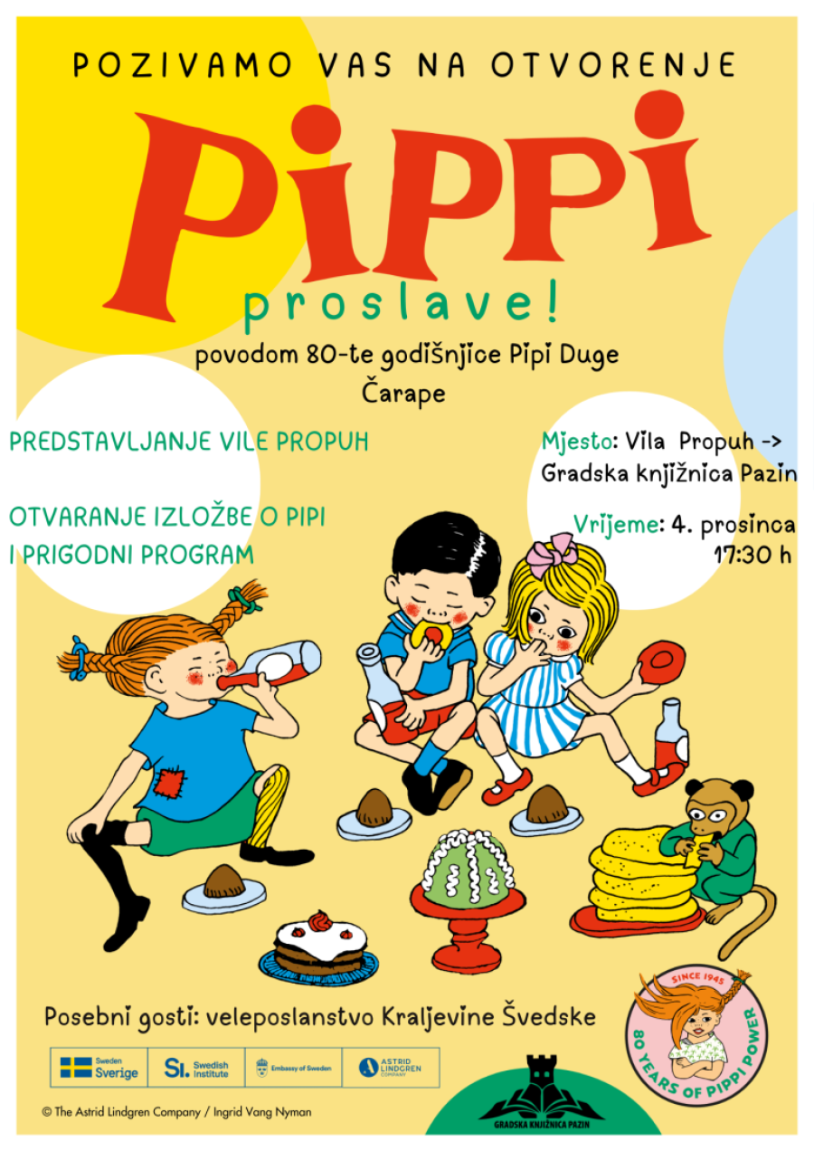 Gradska knjižnica Pazin organizira trotjednu proslavu povodom 80. rođendana Pipi Duge Čarape. Svečano otvorenje održat će se u četvrtak, 4. prosinca u 17:30 u prostorima Knjižnice. Na otvorenju će sudjelovati zamjenica veleposlanice Kraljevine Švedske, Kristine Lindberg.