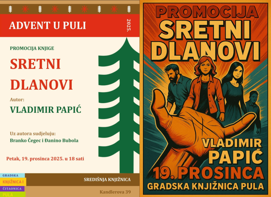Nova zbirka priča Vladimira Papića Sretni dlanovi bit će predstavljena u dvorani Središnje knjižnice u Puli, u petak, 19. prosinca 2025.