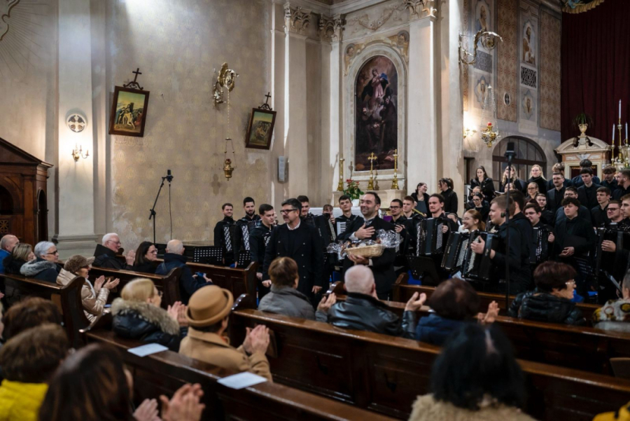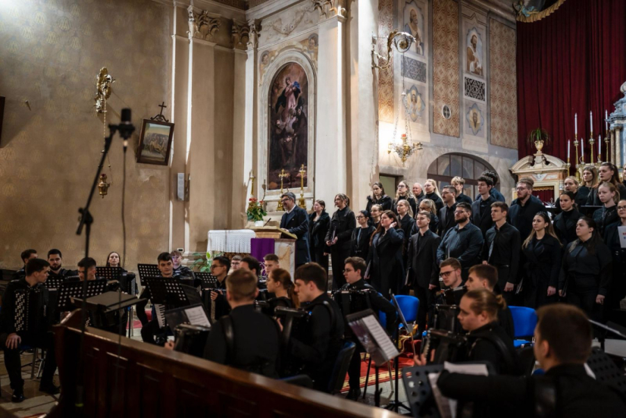 Na programu se našla Haydnova “Harmoniemesse” u B-duru, jedno od njegovih posljednjih velikih sakralnih djela, koje je ovom prigodom izvedeno u posebnoj i rijetko slušanoj verziji za harmonikaški orkestar, mješoviti zbor i soliste, pruživši publici jedinstvenu priliku da cjelovitu misu doživi u drukčijem, svježem i izrazito dojmljivom zvučnom ruhu.