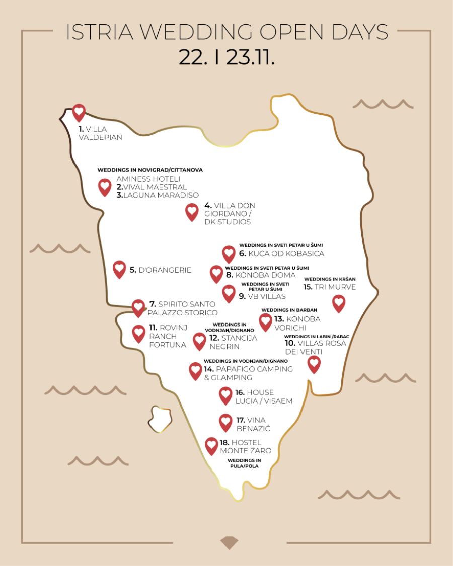 Tijekom 22. i 23. studenog od 11 do 16 sati, posjetitelji će moći obići 18 lokacija diljem Istre, od Savudrije do Pule. Svaka lokacija predstavlja jedinstven spoj usluga te otvara vrata svim budućim mladencima i wedding profesionalcima. Lokacije od sjevera prema jugu Istre su: