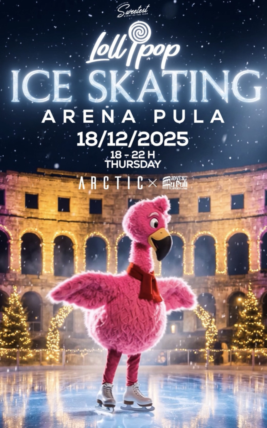Lollipop party na klizalištu donosi adventski spektakl s urbanim potpisom, spoj glazbe, leda i mladenačke energije, koji će obilježiti prosinačke večeri u Puli. Ulaznice se kupuju na ulazu u klizalište po cijeni od 6 eura, dok najam klizaljki iznosi 3 eura.
