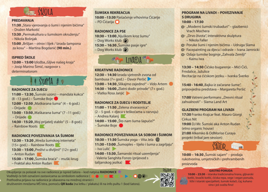 Program je i ove godine raznolik te sadrži brojne radionice za povezivanje sa šumom, radionice za povezivanje sa sobom i šumom, kao i aktivnosti za povezivanje s drugima, a sve u skladu sa sloganom Festivala koji glasi "Povežimo se sa sobom, s drugima i sa šumom".