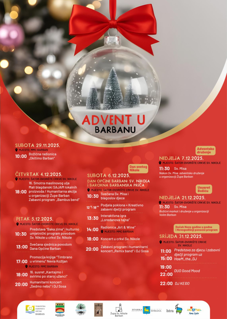 Organizatori – Općina Barban, Župa Barban, Turistička zajednica Općine Barban i partneri Udruga Barbačana, KUD Barban – s radošću pozivaju sve da posjete Barban i osjete toplinu zajedništva, radost blagdana i čaroliju adventa koja se neće zaboraviti.