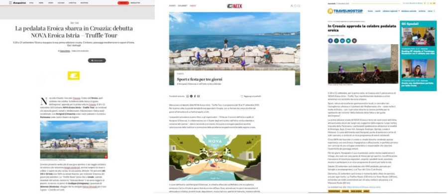 NOVA Eroica Istria - Italija, rujan 2025. - Esquire Italia, MCG Week i Travelnonstop donose reportaže o premijernom izdanju NOVA Eroica Istria – Truffle Tour, biciklističkom događanju koje je u rujnu spojilo gravel vožnju, autentične istarske krajolike i okuse tartufa.