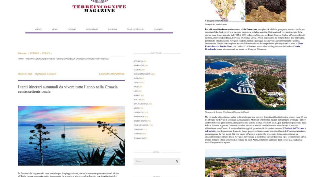 Jesenski itinerari za cijelu godinu u sjevernoj i središnjoj Hrvatskoj - Italija, listopad 2025. - Magazin Terre Incognite, poznat po temama vezanima uz održivi turizam i autentična putovanja, objavio je članak koji ističe bogatstvo jesenskih itinerara u sjevernoj i središnjoj Hrvatskoj, s posebnim fokusom na Istru.