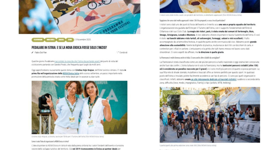 Vožnja kroz Istru: je li NOVA Eroica tek početak nezaboravne biciklističke priče? - Italija, studeni 2025. - Talijanski biciklistički portal Bici.Style objavio je još jedan inspirativni članak koji promišlja o potencijalu Istre kao destinacije za cjelogodišnji cikloturizam, s posebnim osvrtom na uspjeh premijernog izdanja manifestacije NOVA Eroica Istria.