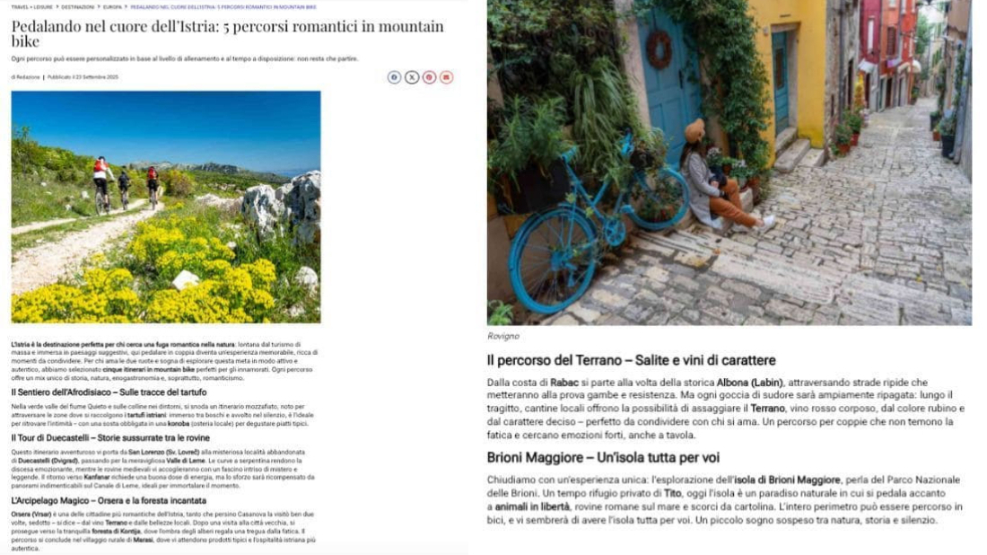 Pedaliranje u srcu Istre: 5 romantičnih ruta za vožnju brdskim biciklom - Italija, rujan 2025. - U izdanju talijanskog magazina Travel + Leisure Italia objavljen je članak koji donosi vodič kroz pet najromantičnijih MTB ruta u središnjoj Istri.