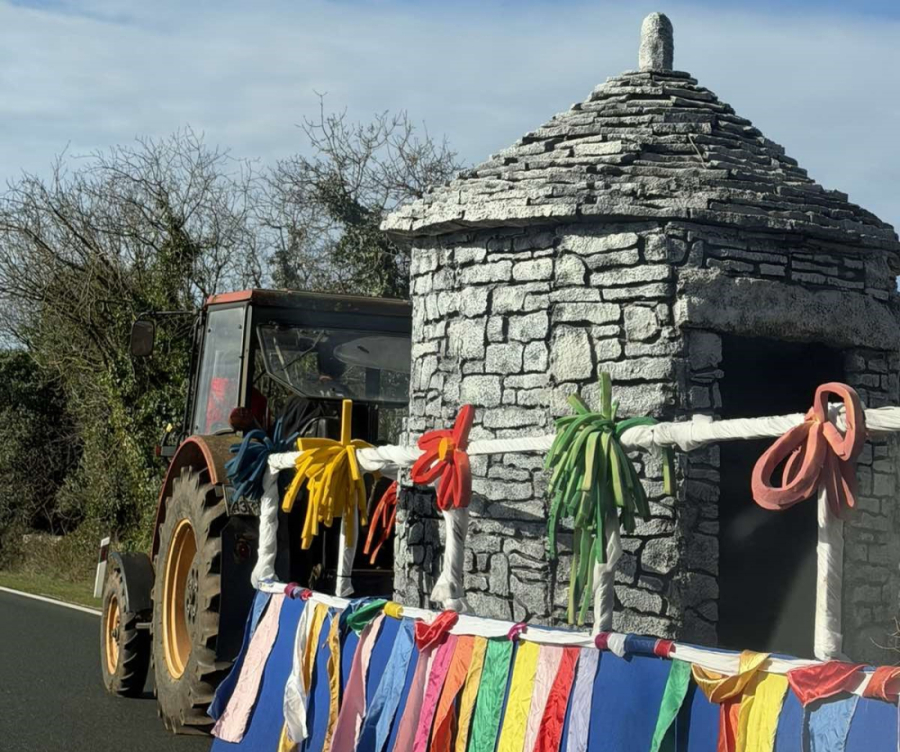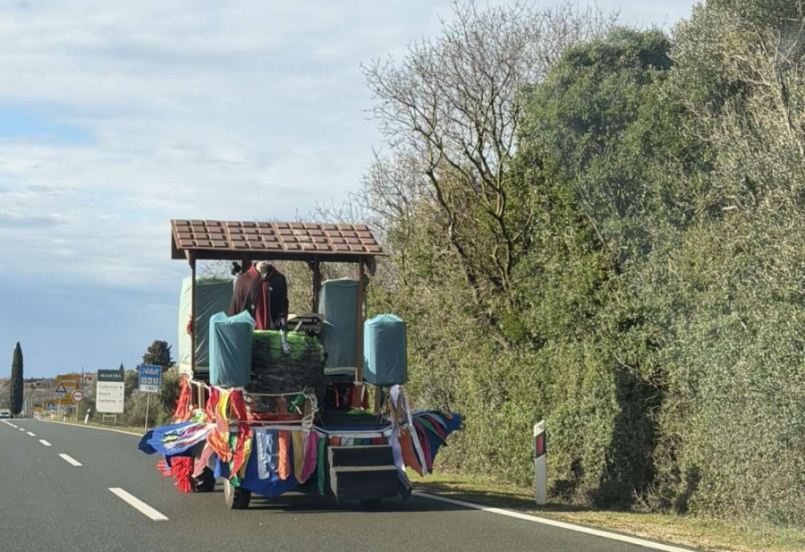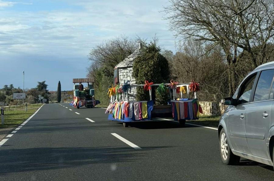 Neobičan prizor jutros je dočekao vozače na relaciji Rovinj – Rovinjsko Selo. Umjesto uobičajenog nedjeljnog prometa, cestom su se kretali traktori s bogato ukrašenim prikolicama pretvorenima u prave male karnevalske pozornice.
