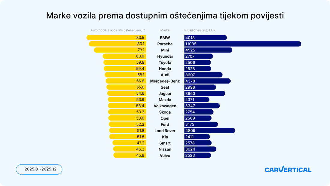 Istraživanje tvrtke carVertical analiziralo je izvješća o povijesti vozila koja su korisnici ove tvrtke kupili u 24 države u razdoblju od siječnja do prosinca 2025. Zabilježena šteta koja je bila navedena na izvješćima bila je grupirana po marki i modelu vozila te analizirana, preračunata u postotke i pravilno rangirana.