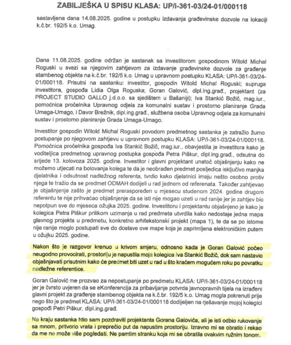 No, nekoliko sati nakon objave njegovog reagiranja, Grad Umag odgovara novim dokumentom – proširenom verzijom iste bilješke. U toj verziji stoji kako je Galović bio neugodan, odbio rukovanje i čak fizički zapriječio izlaz službeniku Brežniku, čime cijela priča poprima sasvim drugačiju dimenziju.