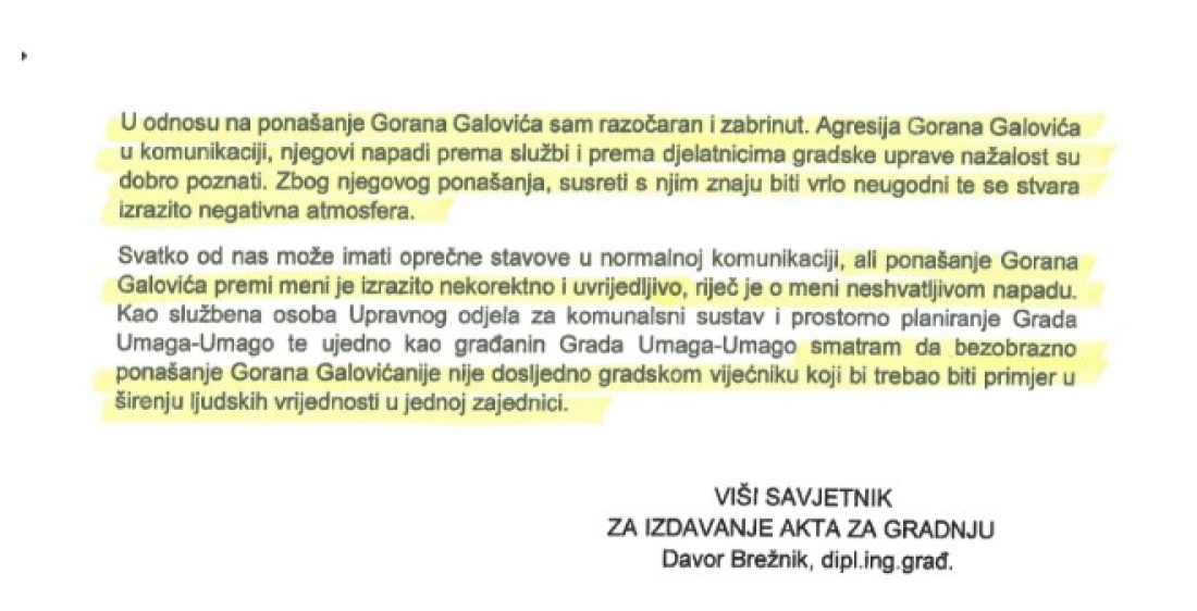 Galović, međutim, sve to kategorički odbacuje. U demantiju kojeg je poslao na adresu IstraIN-a, govori o „najgnjusnijim lažima“ te prilaže službenu bilješku sastanka koju potpisuje gradski službenik Davor Brežnik.